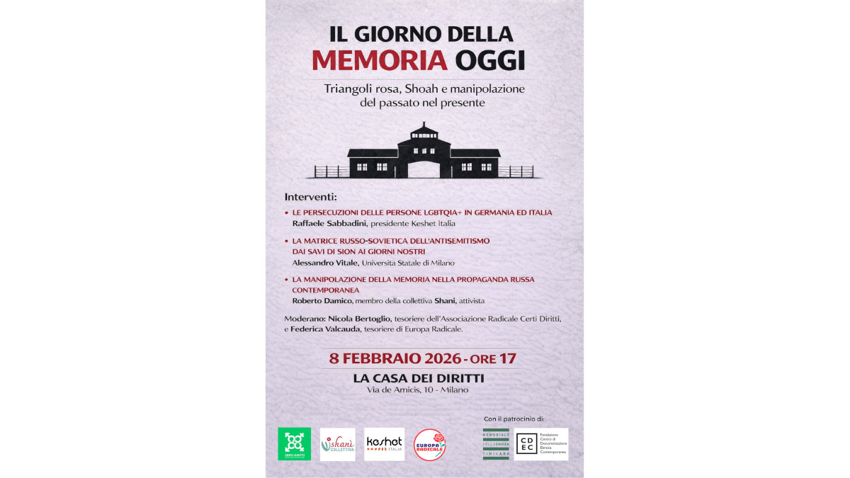 Interverranno: Raffaele Sabbadini, Presidente Keshet Italia, sulla persecuzioni nazi-fasciste delle persone LGBTQIA+, Alessandro Vitale, Università Statale di Milano, e Roberto Damico, attivista, membro della Collettiva Shani, per articolare il ragionamento sulla propaganda contemporanea e sulle sue radici. Saluti iniziali di Emanuele Fiano, presidente Sinistra per Israele.