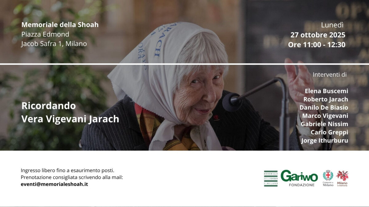 Nata a Milano il 5 marzo 1928, giornalista, testimone della Shoah e cofondatrice delle Madri di Plaza de Mayo, Vera Vigevani Jarach, Ambrogino d’Oro, che nel 2013 intervenne al Memoriale dando Testimonianza pubblica, è onorata al Giardino dei Giusti di Milano, dove un cippo la ricorda dal 2023 per aver fatto della memoria, della giustizia e della verità i tre pilastri della propria vita.