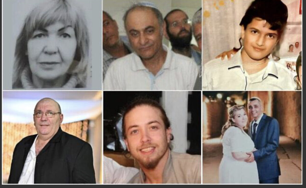 Foto in alto: le vittime uccise in un attacco terroristico a Gerusalemme il 27 gennaio 2023, in senso orario da destra in alto: Asher Natan, Eli e Natali Mizrahi, Ilya Sosansky, Rafael Ben Eliyahu, Irina Korolova, Shaul Hai. (Per gentile concessione TOI)