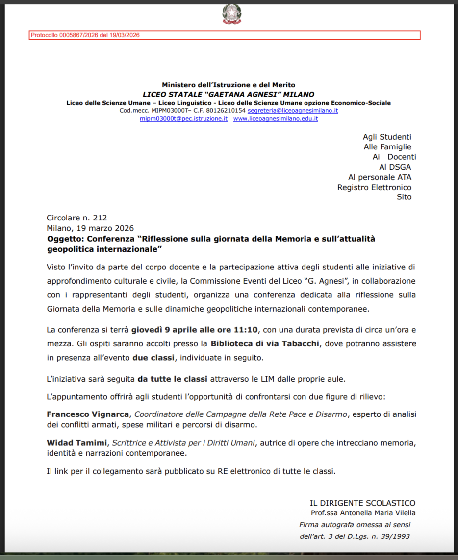 Secondo la testimonianza di Atzeni, è previsto per il 9 aprile un incontro al Liceo Agnesi dal titolo Riflessione sulla Giornata della Memoria e sull’attualità geopolitica internazionale. Nella circolare c’è scritto che “l’appuntamento offrirà agli studenti l’opportunità di confrontarsi con due figure di rilievo: Francesco Vignarca, Coordinatore delle Campagne della Rete Pace e Disarmo, esperto di analisi dei conflitti armati, spese militari e percorsi di disarmo, e Widad Tamimi, Scrittrice e Attivista per i Diritti Umani, autrice di opere che intrecciano memoria, identità e narrazioni contemporanee”.