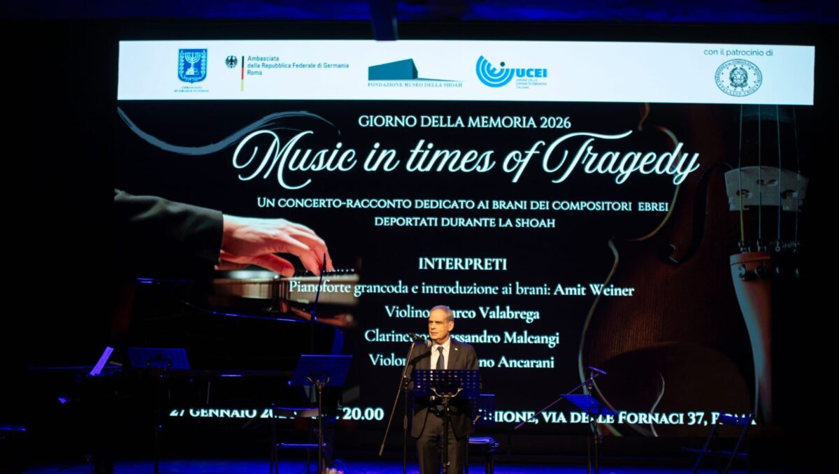 In occasione del Giorno della Memoria, il Teatro Ghione di Roma ha ospitato Music in Times of Tragedy, un concerto-racconto che ha restituito voce ai compositori ebrei deportati durante la Shoah attraverso l’esecuzione delle loro opere. L’evento, ideato e condotto al pianoforte da Amit Weiner, ha visto esibirsi sul palco Marco Valabrega al violino, Alessandro Melcangi al clarinetto e Adriano Ancarani al violoncello. L’iniziativa è stata organizzata dalla Fondazione Museo della Shoah, dall’Ambasciata di Israele in Italia, dall’Ambasciata della Repubblica Federale di Germania e dall’Unione delle Comunità Ebraiche Italiane (UCEI), con il patrocinio della Presidenza del Consiglio dei Ministri.