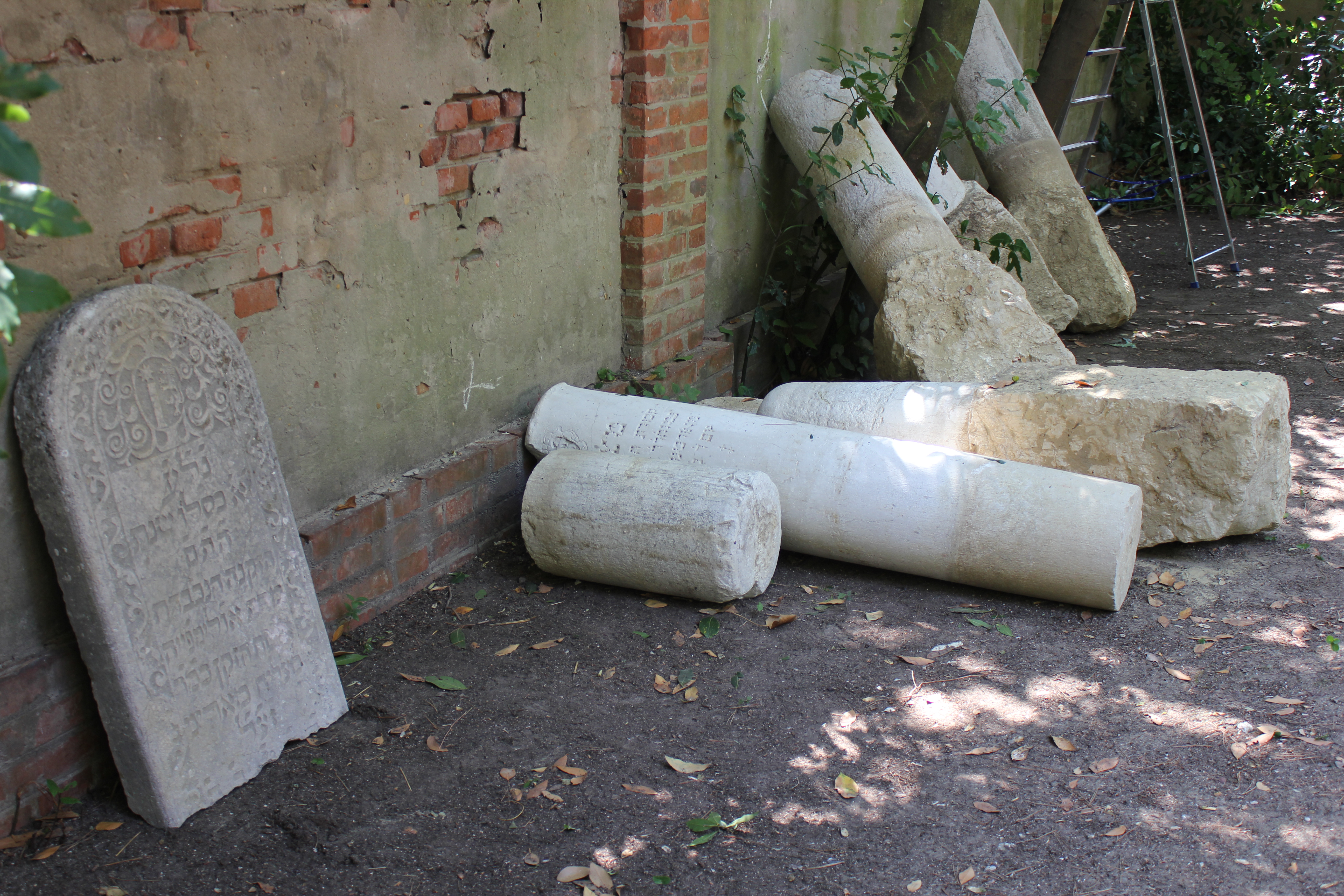 Le antiche lapidi dei cimiteri abbandonati, spesso interrate nel momento stesso della collocazione sulle tombe a causa di una Bolla papale che vietava di segnalare le sepolture in modo da non preservare la memoria dei defunti ebrei, erano nei secoli rimaste sepolte nei terreni paludosi vicini alla città. Qualche anno fa, durante lavori di costruzione di nuovi quartieri, alcuni cippi devono essere riaffiorati e il precedente proprietario della villa ha creduto bene di collocare i “cimeli storici” in giardino, come basamenti per fioriere.