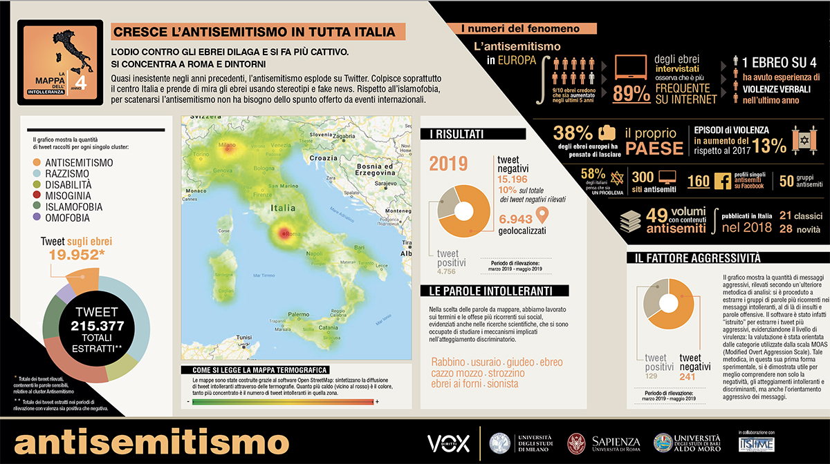 Fra marzo e maggio del 2019 l’odio contro i migranti registra un più 15,1%, mentre l’intolleranza contro gli ebrei, di fatto quasi inesistente fino al 2018, quest’anno registra un più 6,4% (76,1% sul totale dei tweet sugli ebrei). Colpisce soprattutto il centro Italia e prende di mira gli ebrei usando stereotipi e fake news. Rispetto all’islamofobia (che cresce del +6,9%) per scatenarsi l’antisemitismo non ha bisogno dello spunto offerto da eventi internazionali. Fra le offese più ricorrenti: rabbino, usuraio, giudeo, strozzino, ebrei ai forni , sionista.
