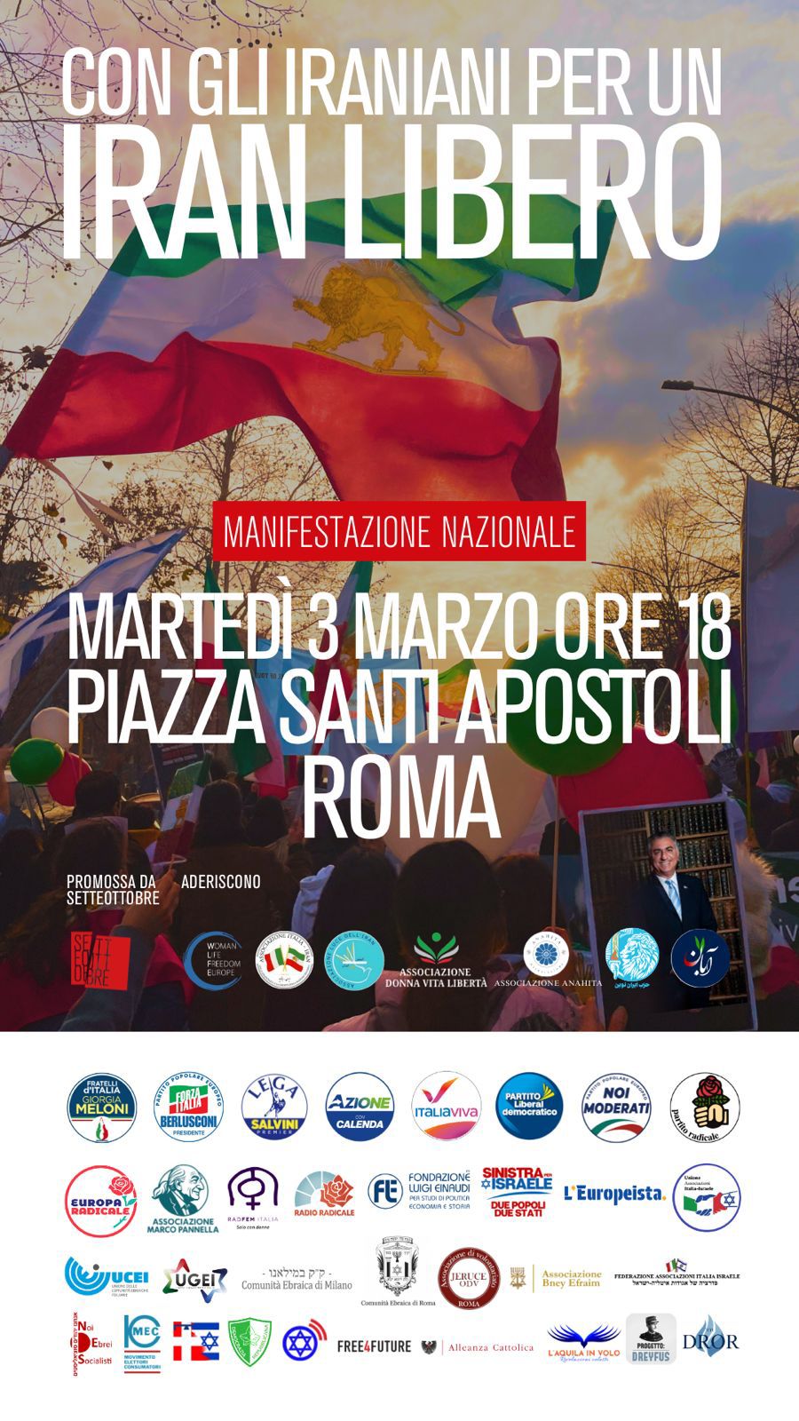 Martedì 3 marzo alle ore 18, a piazza Santi Apostoli a Roma si terrà una manifestaizone in difesa di un Iran libero dalla dittatura islamica. L’iniziativa è promossa dall’associazione Setteottobre: aderiscono Woman Life Freedom Europe, Associaizone Italia-Iran, Associazione Luce dell’Iran, Associazione Donna Vita Libertà, Associazione Anahita.