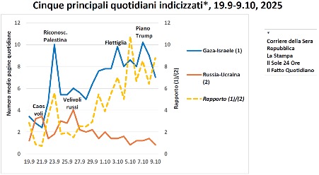 Con un gruppo di collaboratrici – Barbara Gerber Sasson, Gabriella Moise, Manuela Cohen –, abbiamo condotto una prima, sommaria esplorazione dei contenuti della stampa quotidiana in Italia nel corso delle tre settimane dal 19 settembre al 9 ottobre 2025. Abbiamo esaminato migliaia di pagine di quotidiani. I contenuti di 11 fra i principali quotidiani nazionali (5 inidcizzati ogni giorno, 6 in parte) ci illuminano sul livello di evidenza attribuito al conflitto Gaza-Israele e sui contenuti dei messaggi trasmessi, soprattutto se paragonati al conflitto Russia-Ucraina.