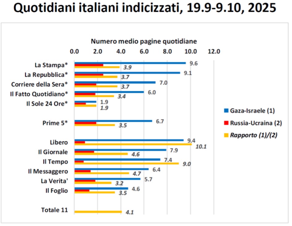 Il numero di pagine dedicate al conflitto Gaza-Israele si avvicina a una media di 7, e spesso supera una media di 10 pagine quotidiane, fino a casi estremi di quasi 20. Si tratta di un livello di copertura che si può ben definire patologico. Le molte pagine dedicate a Gaza-Israele superano quelle dedicate al conflitto Russia-Ucraina in un rapporto di 4 volte a 1.