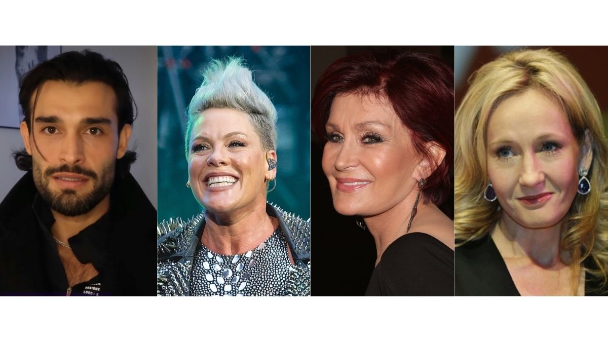 Da sinistra in alto: Sam Asghari (screenshot da Instagram), Pink e Sharon Osbourne (Wikipedia) e J.K Rowling