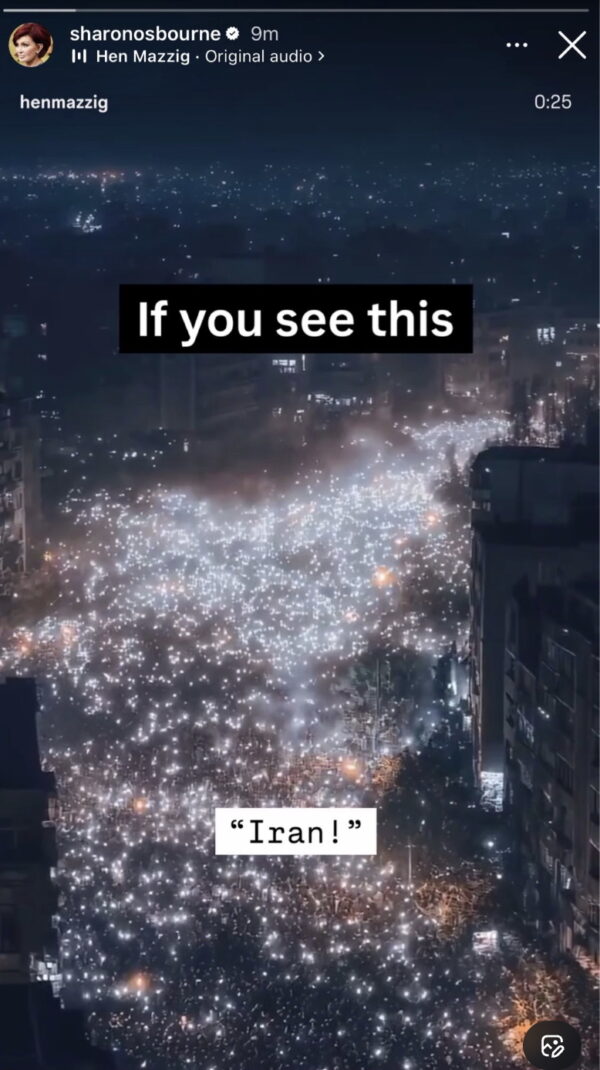 Sharon Rachel Osbourne (nata Levy), produttrice discografica britannica e moglie del cantante metal Ozzy Osbourne, ha pubblicato sul suo profilo l’immagine ripresa dall’alto della folla oceanica dei manifestanti iraniani.