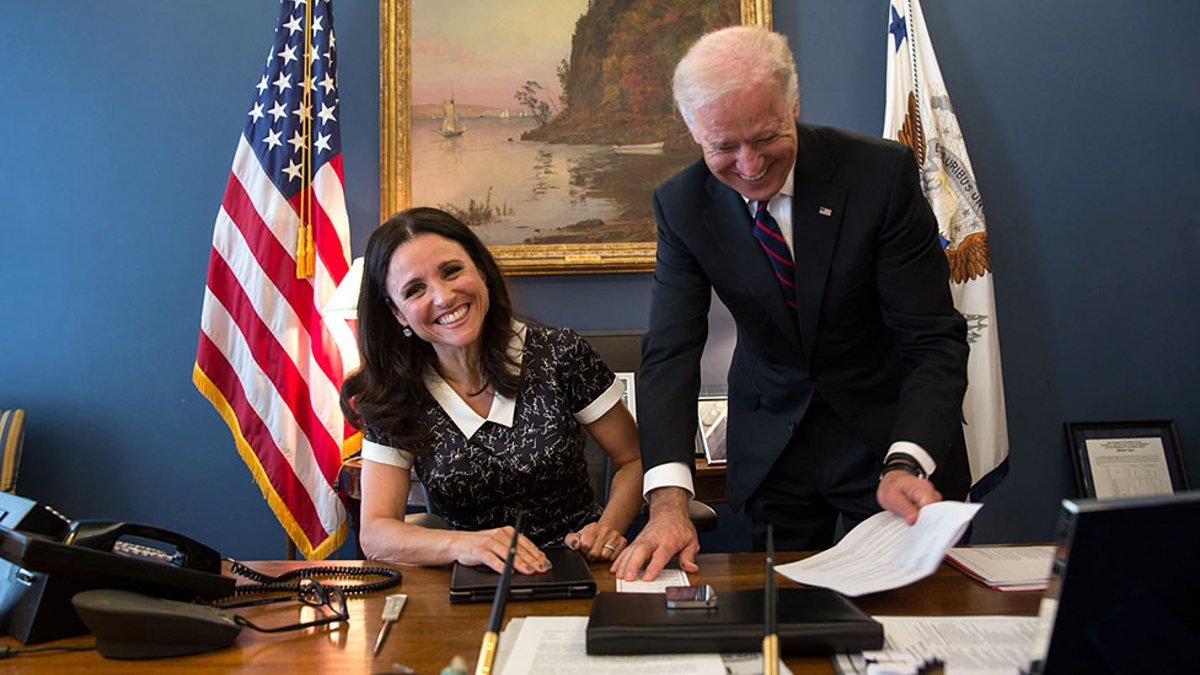 (Nella foto, nel 2013 Julia Louis-Dreyfus con Joe Biden, allora vice-presidente Usa, durante una puntata di Veep)