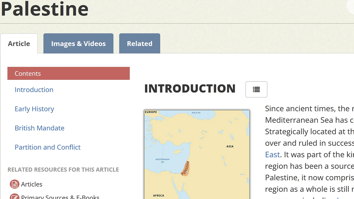 Nella versione live della voce in questione pubblicata domenica, la mappa è stata rimossa e sostituita con un’immagine di uliveti. La foto stessa esiste ancora sul sito Britannica Kids, con una didascalia che recita: “Il nome Palestina si riferisce a una regione del Medio Oriente. La regione si trova tra il fiume Giordano e il Mar Mediterraneo”.