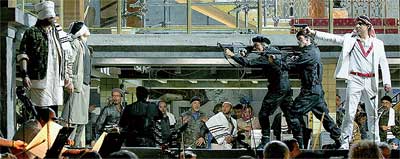 Sul palco un Osama Bin Mosè, che grida al cielo la sua sete di vendetta e l’odio per gli Egizi. E il cielo risponde con kamikaze e gas letali che uccidono i primogeniti.