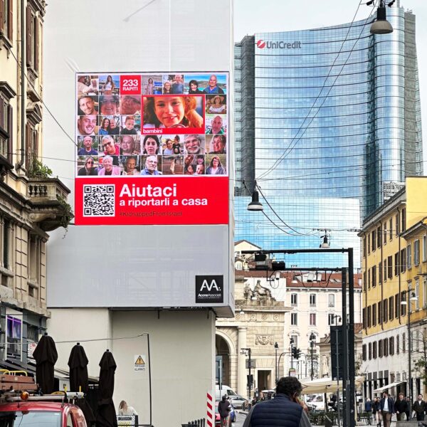 ‘Liberate gli ostaggi. 37 bambini rapiti da Hamas’ e la foto di due dei bambini israeliani ostaggi a Gaza: è quanto si legge su tre grandi cartelloni (12 metri per 6) collocati da venerdì 3 novembre in Corso di Porta Romana, Corso Buenos Aires- angolo via Palazzi, e via Stephenson, verso l’autostrada.