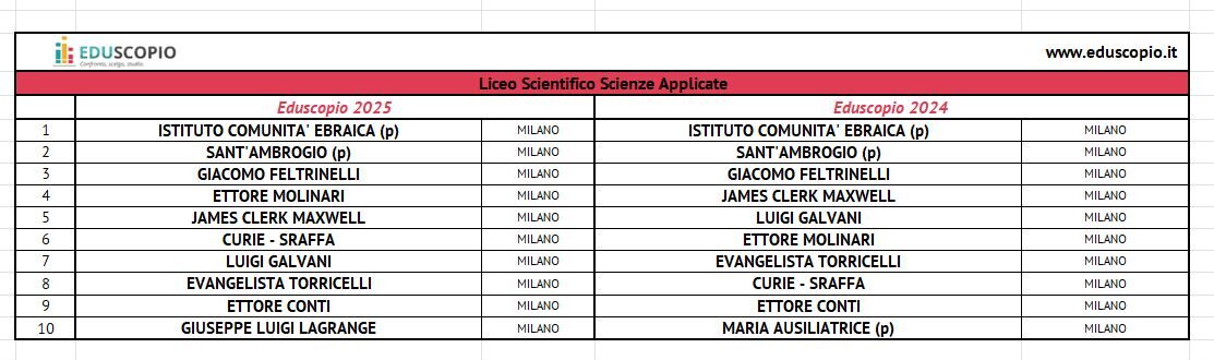 Il Liceo Scientifico a indirizzo scienze applicate della Scuola della Comunità ebraica di Milano è al primo posto nella classifica Eduscopio dei migliori istituti superiori di Milano della sua categoria. Il Liceo è in vetta alla classifica per il quinto anno consecutivo, a conferma che la qualità didattica ne è una costante nel tempo. Eduscopio è lo studio della Fondazione Agnelli che ogni anno stila la classifica delle scuole italiane, città per città, che meglio preparano agli studi universitari o al lavoro dopo il diploma. Lo scopo è aiutare studenti e famiglie a scegliere l’istituto scolastico successivo alla terza media.