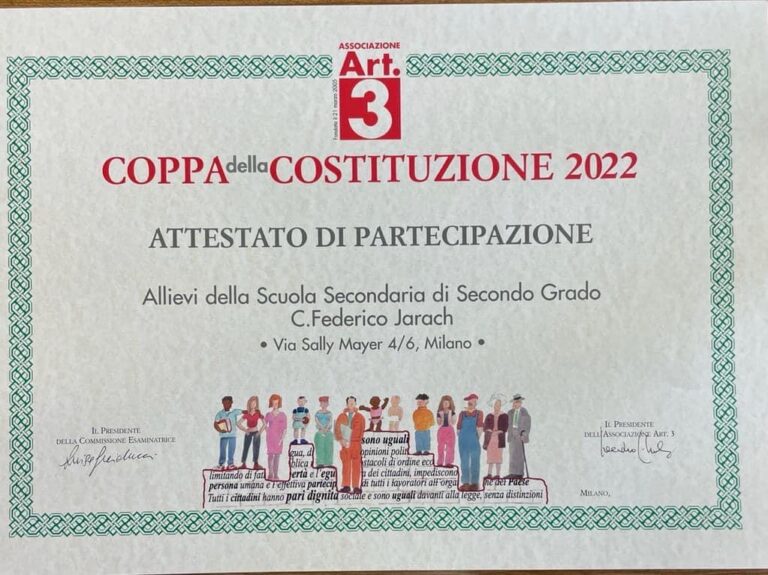 Tutte le classi dell’Istituto tecnico RIM sono state invece invitate dall’Associazione “Art.3” a partecipare, insieme ad altre scuole secondarie di secondo grado di Milano e hinterland al concorso «Coppa della Costituzione». L’Associazione Art. 3 mette in palio, in una competizione tra Istituti scolastici, la “Coppa della Costituzione” allo scopo di diffondere e premiare la conoscenza della Carta fondamentale da parte degli studenti delle scuole superiori italiane.