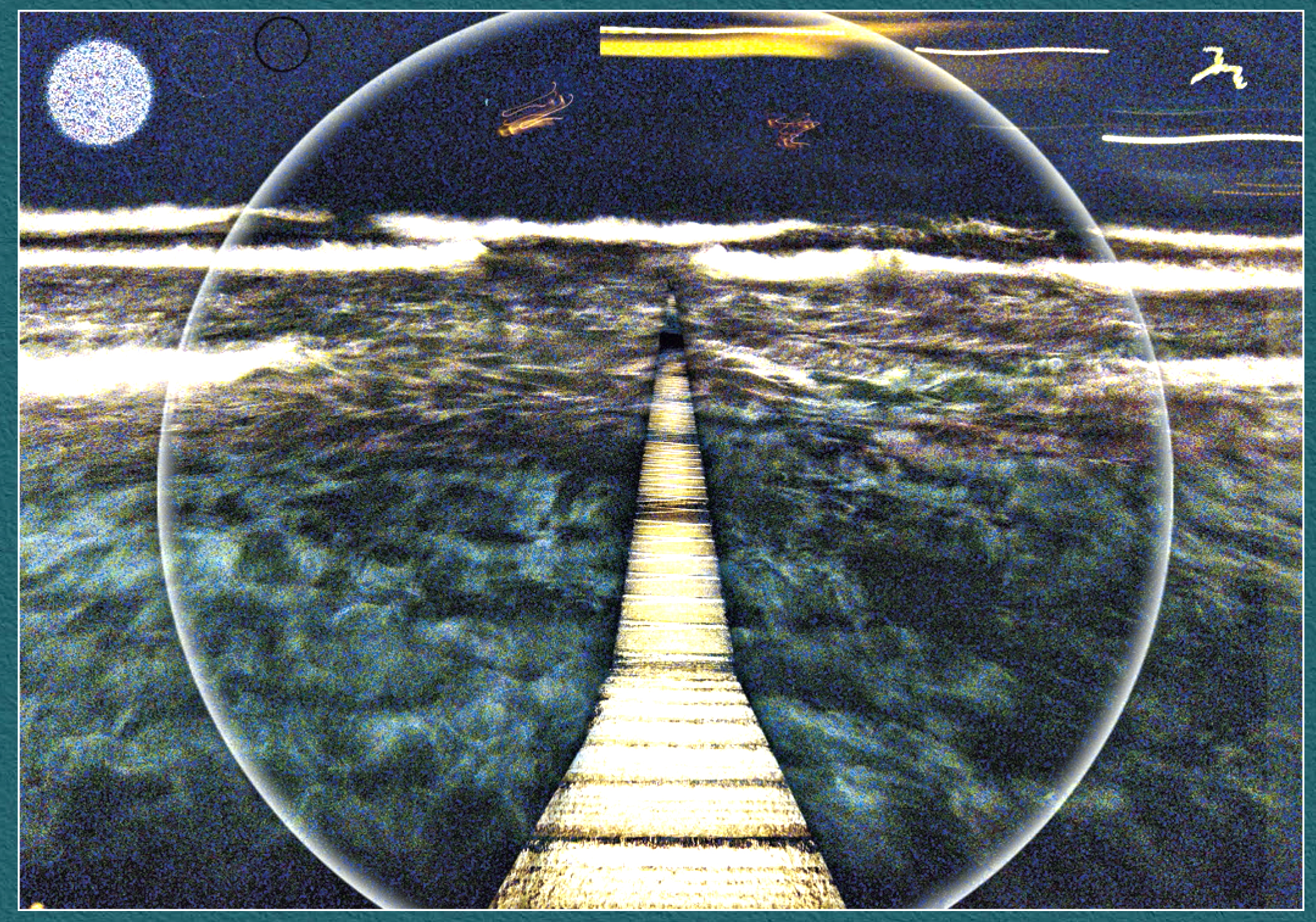 Per capirlo, osserviamo ad esempio Pontile: immagine di un lungo, pallido pontile che s’inoltra nel mare notturno fino a sprofondare fra i flutti, mentre in lontananza le onde, come illuminate da una sconosciuta luna, biancheggiano in uno splendore irreale, reso ancor più fantasmatico dalla presenza di enigmatici oggetti luminosi che solcano il cielo tenebroso. Sembra di vedere una trasposizione in immagine del discorso di Giobbe, che per lodare la potenza e la maestà di Dio, dice a un certo punto di Lui: “Ha tracciato un cerchio sulla superficie delle acque, là dove la luce confina con le tenebre” (Giobbe, 26-10). Ma se viene in mente qui – a proposito di Pontile – il libro di Giobbe, è proprio perché un grande cerchio di luce chiara, un ampio e sottile alone luminoso inquadra e protegge il pontile che s’inoltra dentro le tenebre marine: lo delimita con una linea di così profonda quiete, di così delicata pace, da farci capire che quel pontile non s’inabissa verso l’orrore di un nulla senza senso, ma si congiunge con l’infinito.