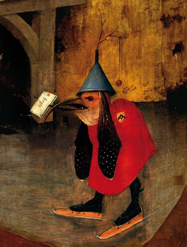 Se queste rappresentazioni in forma umana ricalcano pedissequamente lo stereotipo classico medievale degli Ebrei, cocciuti negatori della vera fede e recalcitranti alla conversione, appare originalissima e non subito evidente la cifra “ebraica” che Bosch impone a molti esserini apparentemente innocui e buffi ed a figure umane caricaturali in scala ridotta che gremiscono il contorno delle scene principali delle sue opere. Essi perlopiù recano come copricapo un curioso imbuto rovesciato che talora ne copre il corpo come un’armatura. Questo imbuto altro non è che la trasformazione fantasiosa del cappello a forma di cono che in molte regioni d’ Europa gli Ebrei erano costretti ad indossare come segno distintivo, al pari della rotella gialla sul mantello.