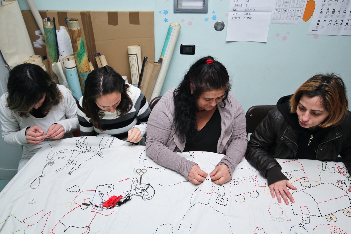 Alice ha parlato alle detenute Rom con l’aiuto dell’attrice e regista Djiana Pavlovic, che è riuscita a motivarle e a trasmettere un grande entusiasmo a tutte loro, per creare qualcosa che raccontasse ciò che è stato dimenticato. Alla fine, sono state molte quelle che hanno chiesto di collaborare alla realizzazione dei pannelli di tela ricamata per la mostra. «Molte non sapevano neppure cucire – racconta Alice -. Io ho elaborato i disegni di base, ma poi le detenute hanno aggiunto del loro, ognuna con il suo particolare punto, chi più lungo, chi più serrato. Una ha voluto dedicarsi solo alla staccionata. Le ragazze Rom aggiungono maggiori dettagli, perline, orecchini. E soprattutto si impegnano sugli occhi, espressivi, intensi. Una di loro, in ricordo del nonno, ricama cavalli e carri, come per una partenza improvvisa. È un progetto densissimo; non avevo mai lavorato né con le Rom né con le detenute in generale. Mi sono affezionata, sono molto coinvolta a livello emotivo. Lavoriamo tutte insieme nella biblioteca del carcere. Si è creato un clima di convivenza, bellissimo. C’è integrazione, come è difficile che solitamente accada tra le rom e le altre detenute in carcere».