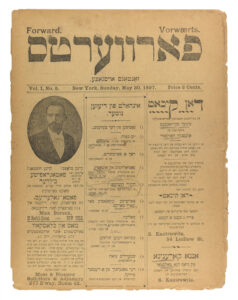 Proseguendo, una sezione interessante è dedicata alle riviste stampate in lingua yiddish. La più conosciuta e famosa di tutte è il Forverts, pubblicata a New York, di cui possiamo ammirare una delle prime copie, esattamente la numero cinque, datata al 30 maggio del 1897. Fondato da Abraham Cahan è stato uno dei periodici yiddish di piu ampio successo nella storia. Nel 1920 aveva raggiunto un milione di lettori. Nel corso della sua storia, oltre a parlare poi di letteratura e poesia è stato un prezioso aiuto per gli immigrati di lingua yiddish arrivati in America, poiché dava loro indicazioni su come votare, come farsi un’assicurazione o come si doveva camminare per le strade senza essere derubati.