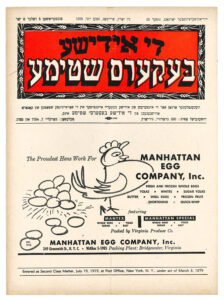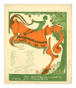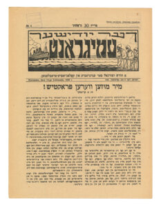 Nel periodo tra le due guerre, le piccole riviste yiddish fiorirono a livello globale, tra queste, incontriamo a Varsavia il Khalyastre (La Banda), i cui contenuti rispecchiano il tumulto della cultura ebraica del periodo, vivacissima testata su cui intervenivano anche autori come Isaac B. Singer. The Jewish Baker’s Voice, pubblicato nella Grande Mela, settimanalmente in yiddish e in inglese, è stato la voce dei panettieri ebrei newyorkesi che reclamavano i loro diritti di lavoratori per ottenere condizioni migliori. In origine le panetterie ebraiche non erano regolamentate e i fornai lavoravano in ambienti insopportabilmente caldi, dormendo spesso nelle cantine. Da 18 ore al giorno, riuscirono ad ottenere un turno di 7 ore. Sempre in Polonia, Der Yidisher Emigrant offriva principalmente ai potenziali emigranti una prospettiva utile sulle possibili destinazioni. Non poteva mancare un giornalino dedicato ai più piccoli: Kinderland, stampato a New York, era uno di questi, dove si vede nella copertina un’enorme capra arancione cavalcata da una ragazza raffigurata in una verde silhouette. Più “yiddish” di così!