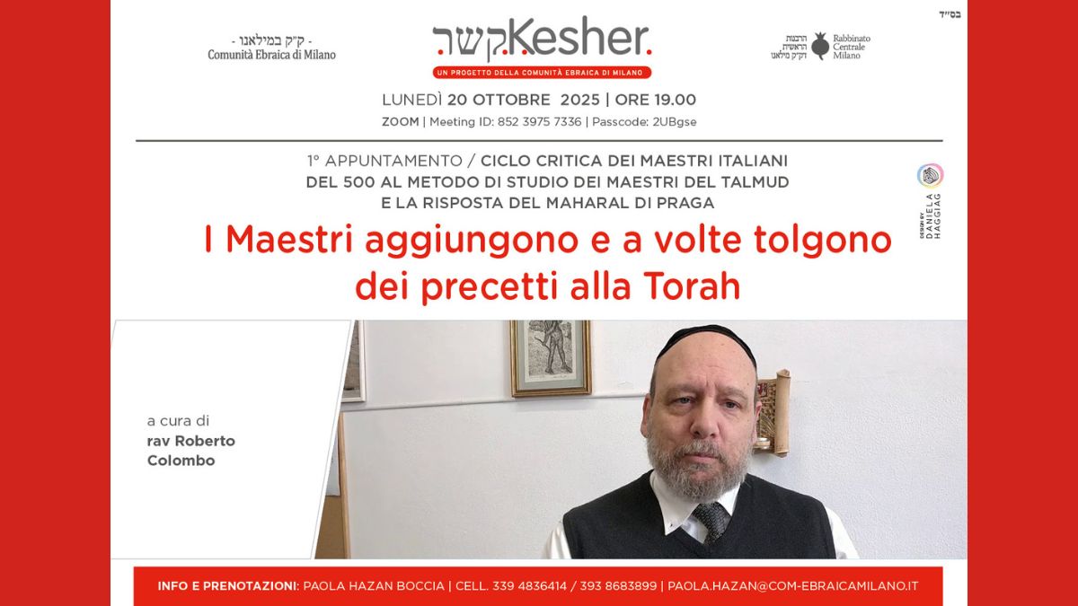 Lunedì 20 ottobre 2025 ore 19:00 I appuntamento CICLO Critica dei Maestri italiani del 500 al metodo di studio dei Maestri del Talmud e la risposta del Maharal di Praga: I Maestri aggiungono e a volte tolgono dei precetti alla Torah
