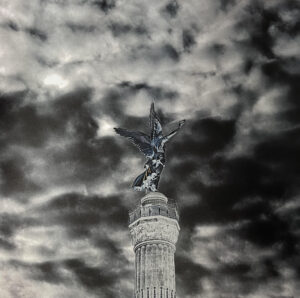 A imprigionare il cielo c’è la cupola della Grande sinagoga con, in cima, troneggiante e dorato, il suo Maghen David, a simbolo e riscatto dell’oscuro passato. E poi, ecco le giostre dei bambini spuntare sotto la neve, un fermo immagine metafisico e astratto che cattura l’innocenza dell’infanzia. O ancora, c’è lo skyline da cartolina a cui la calotta fuligginosa della città regala un’allure sospesa e onirica. Non poteva mancare neppure la colonna con lo svettante angelo in volo, immagine-simbolo di una rinascita. E poi c’è la gente che va e viene, ombre furtive che aspettano la metropolitana, ragazzi che bevono una birra ai tavolini di un caffè, passanti in fuga che tornano a casa la sera. Immagini solarizzate che regalano un senso di sognante e sospeso straniamento.