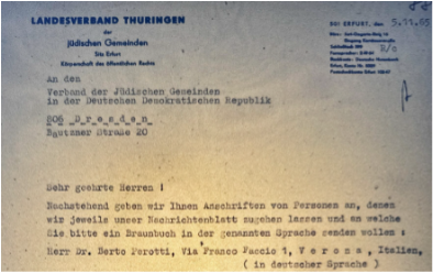 Istituzioni come il Friedensrat (Consiglio per la Pace), il Ministero degli Affari Esteri e la comunità ebraica della Germania Est compilarono liste di contatti di ONG internazionali, leader religiosi e organizzazioni ebraiche per distribuire materiali di propaganda antifascista. Le prove d’archivio rivelano che la comunità ebraica della Turingia identificò specificamente Berto Perotti come un alleato chiave per questa cooperazione. Non sorprende che Perotti fosse una figura nota ai leader ebrei della Germania Est, molti dei quali erano essi stessi veterani della Resistenza.