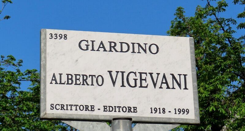 Il giardino è dedicato ad Alberto Vigevani (Milano, 1º agosto 1918 – Milano, 23 febbraio 1999), scrittore, poeta, bibliofilo ed editore di vasta cultura e capace di trasmettere con i suoi scritti l’amore per i libri e per Milano. Oltre a molto altro: storia, passione politica, poesia. Della sua vasta produzione, ricordiamo qui letture quasi commoventi come “All’ombra di mio padre: infanzia milanese”; “La febbre dei libri: memorie di un libraio bibliofilo”; “Milano ancora ieri. Luoghi, persone, ricordi di una città che è diventata metropoli” (tutti pubblicati da Sellerio). La sua avventura umana e intellettuale è segnata dal periodo delle persecuzioni fasciste che lo portano a seguire gli studi universitari a Grenoble, lasciando l’Università Ca’ Foscari di Venezia doveva aveva iniziato a seguire i corsi di Letteratura francese. La passione e le amicizie lo vedono alla fondazione della rivista “Corrente” e poi delle librerie “La lampada”, luogo letterario e di militanza antifascista; e “Il Polifilo”. Il primo romanzo “Erba d’infanzia” è del 1943, subito prima della fuga in Svizzera. Tornato a Milano dopo la Liberazione, prosegue le sue attività di scrittore, critico letterario e teatrale, libraio antiquario, editore.