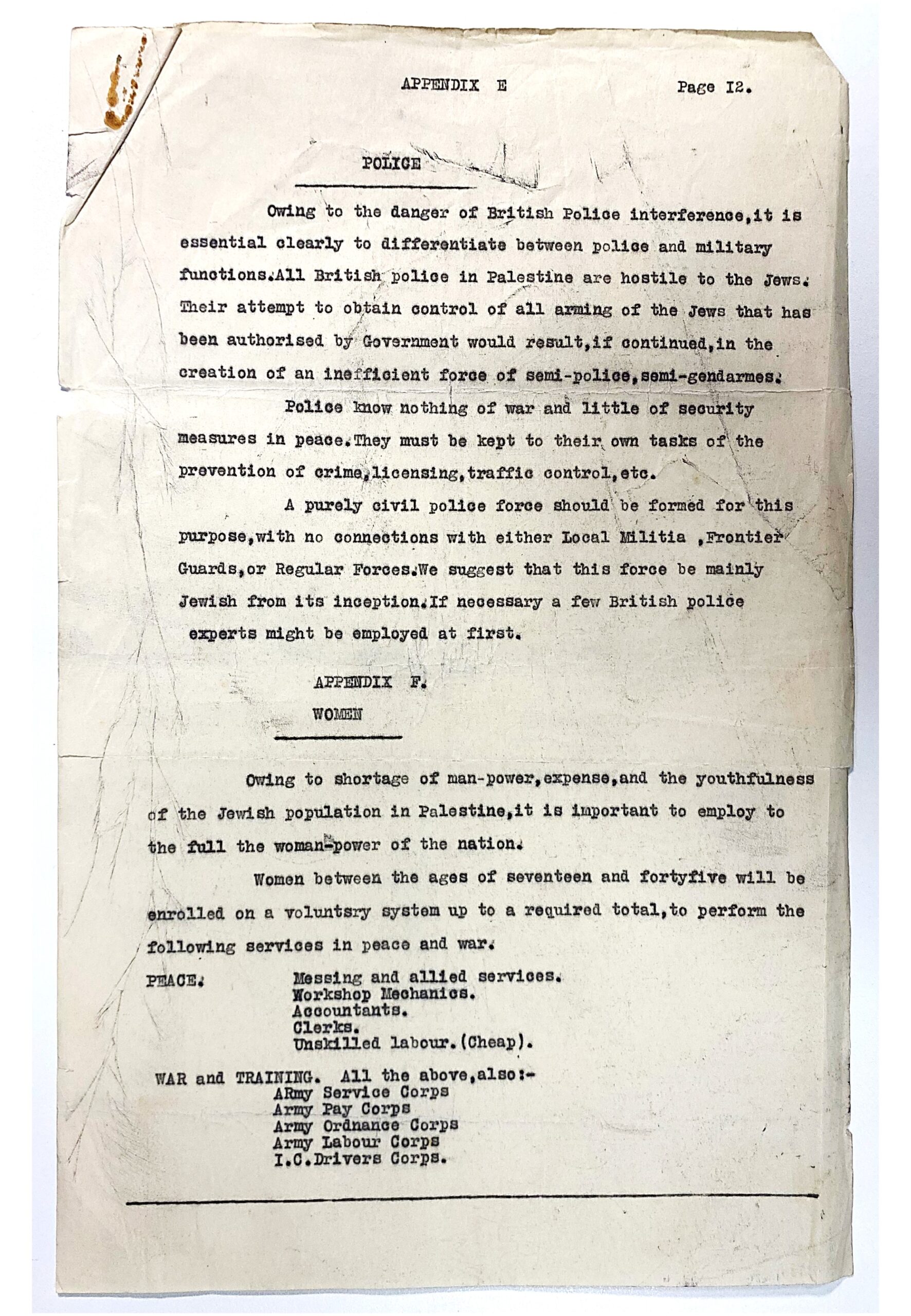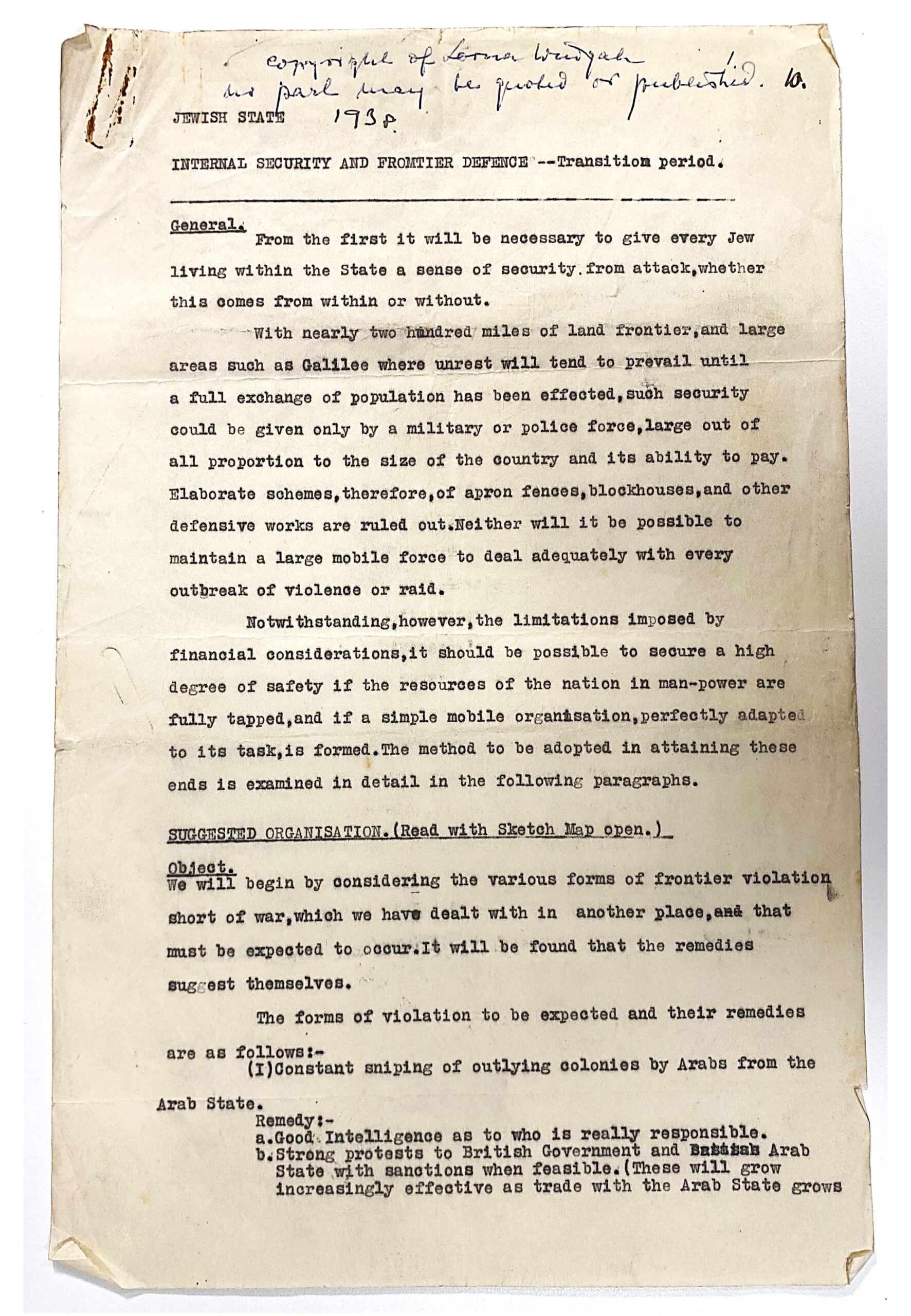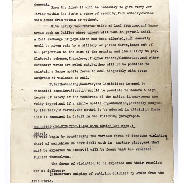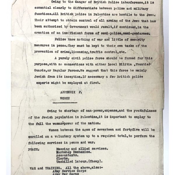 Tra i documenti più rilevanti figurano piani per contrastare la rivolta araba del 1936–1939, rapporti su operazioni di commando e sequestri di armi, materiali sulle Special Night Squads (SNS), unità congiunte anglo-ebraiche attive in Galilea e nella valle di Jezreel ed un documento del 1938 che delinea la struttura difensiva di un futuro Stato ebraico, includendo fanteria, aviazione, sicurezza interna e perfino il ruolo delle donne e lo sviluppo industriale