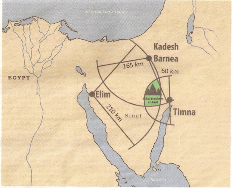 L’Alto Commissariato delle Nazioni Unite per i Profughi (UNHCR) ha stimato che una massa di persone possa muoversi per non più di 15 chilometri al giorno; ne deriva che in 11 giorni i figli di Israele non possono essere andati oltre 165 chilometri da Kadesh Barnea. Questa è la prima informazione geografica che possiamo utilizzare. La seconda informazione deriva dal brano seguente: “Poi partirono da Elim e tutta la comunità dei figli d’Israele giunse al deserto di Sin situato fra Elim ed il Sinai. Era il quindicesimo giorno del secondo mese dopo la loro uscita dall’Egitto” (Shemot 16:1).