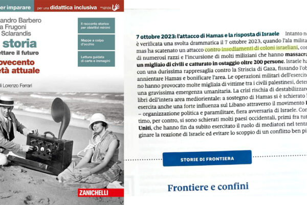 Nel manuale scolastico “La storia 3. Progettare il futuro”, pubblicato da Zanichelli e co-curato dallo storico Alessandro Barbero assieme a Chiara Frugoni e Carla Sclarandis, si legge che il 7 ottobre 2023 “l’ala militare di Hamas ha scatenato un attacco contro insediamenti di coloni israeliani, con il lancio di numerosi razzi e l’incursione di molti miliziani che hanno massacrato più di un migliaio di civili e catturato in ostaggio oltre 200 persone”.