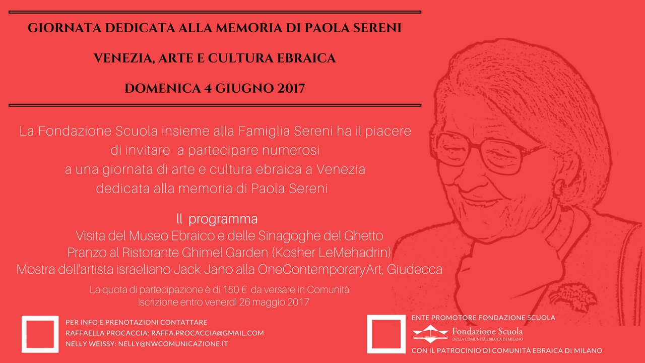 La Fondazione Scuola insieme alla Famiglia Sereni organizza per domenica 4 giugno a Venezia una giornata di arte e cultura ebraica in ricordo di Paola Sereni, amata preside delle Scuole della Comunità ebraica di Milano.