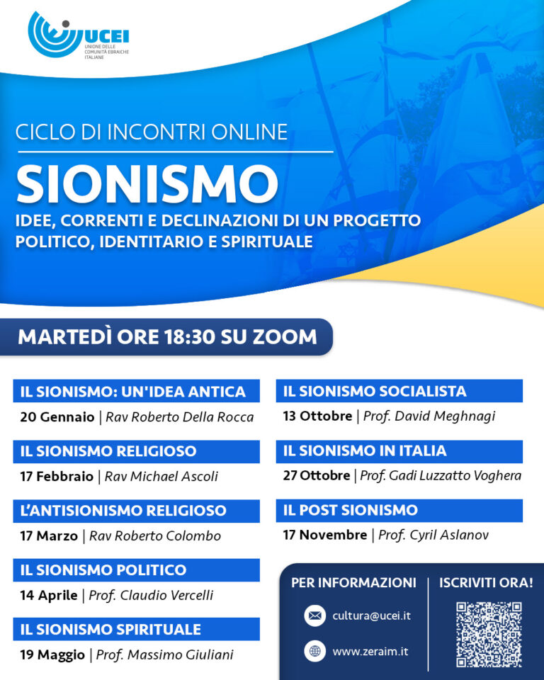 Sionismo | Idee, correnti e declinazioni di un progetto politico, identitario e spirituale è il titolo di un ciclo di otto incontri online su zoom, da gennaio a novembre 2026.