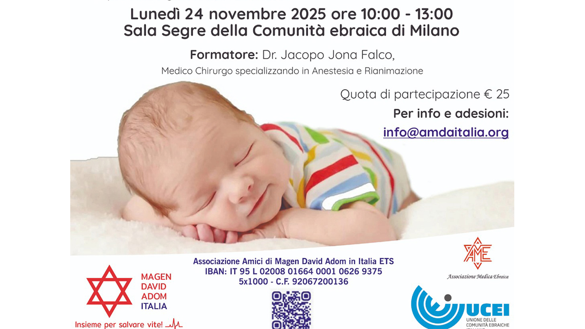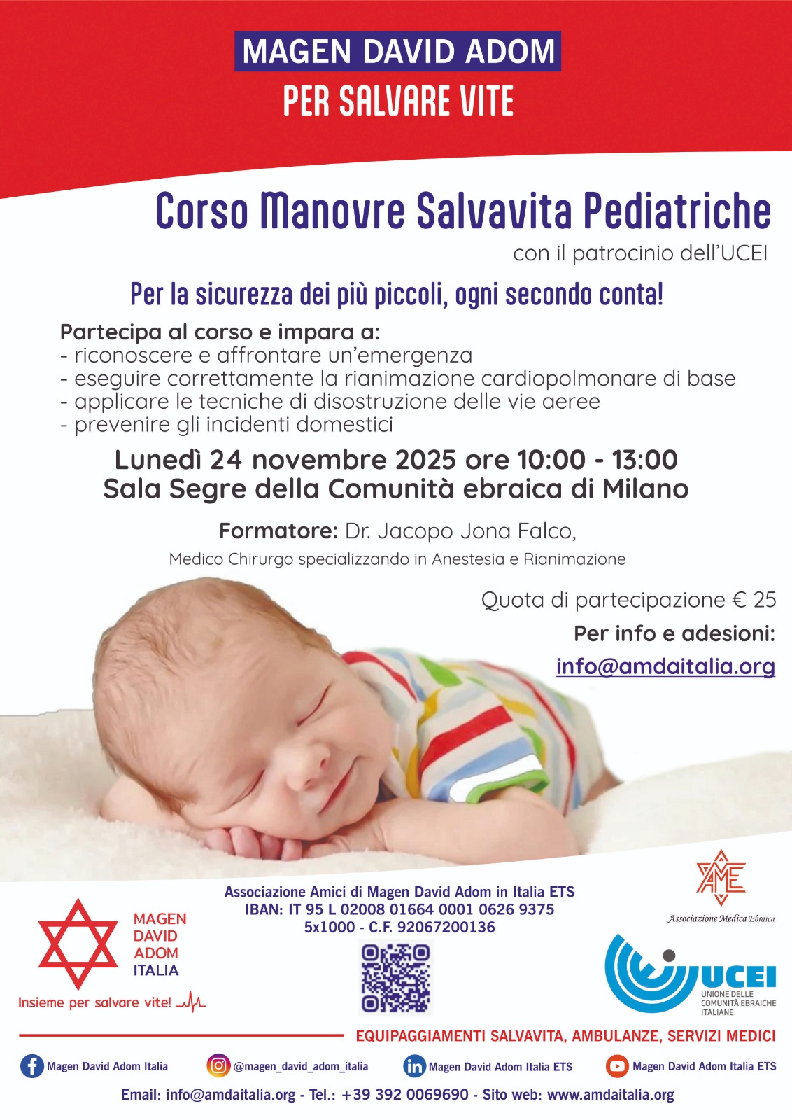 Lunedì 24 novembre 2025 dalle ore 10.00 alle 13.00, nella Sala Segre della Comunità ebraica di Milano, partecipa al corso di manovre salvavita pediatriche, pensato per genitori, futuri genitori, nonni, educatori e chiunque desideri prendersi cura dei più piccoli. Grazie a lezioni pratiche e coinvolgenti, imparerai gesti semplici ma decisivi, come la rianimazione cardiopolmonare e le manovre di disostruzione.
