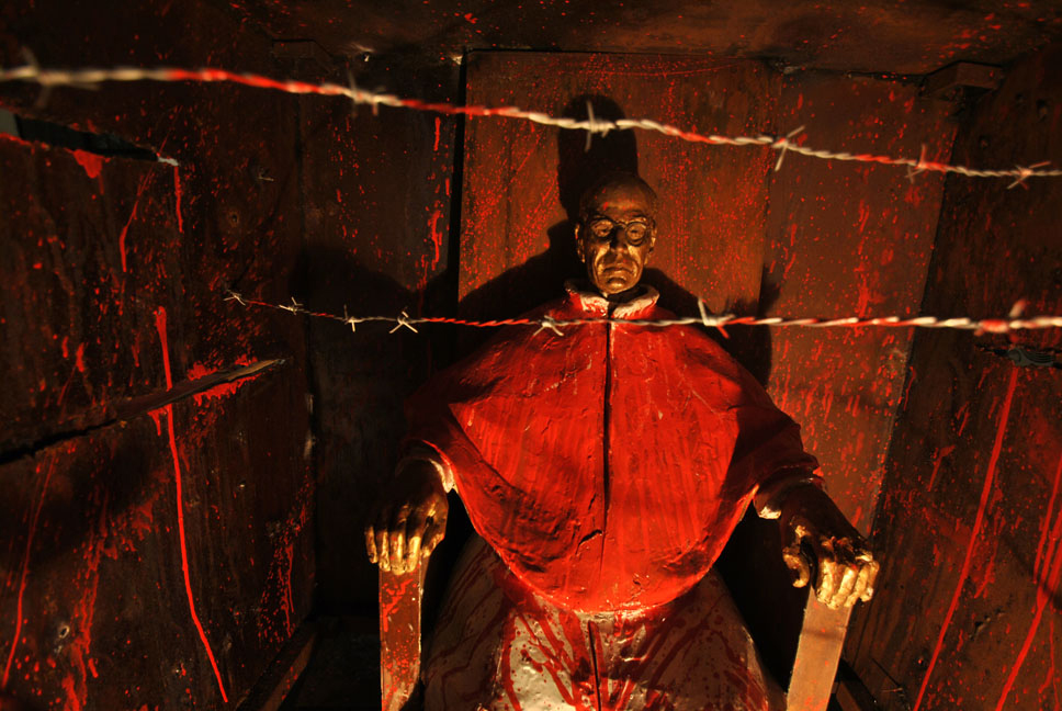 Un cubo arrugginito e rattoppato, con tante fessure da cui cola sangue (vernice rossa): al suo interno, circondato da filo spinato, papa Pio XII seduto sul suo trono, come ad assistere impotente al dramma dell’Olocausto. Ombre spettrali, un’atmosfera livida e claustrofobica. A fare da sottofondo, la frase pronunciata da Mussolini «la nostra coscienza è assolutamente tranquilla!» e il proclama radio del 24 dicembre 1942 di papa Pacelli, insieme ad altre voci e suoni che ricordano quel dramma, emessi da due altoparlanti nascosti all’interno della scatola metallica e che richiamano l’attenzione dello spettatore, invitandolo a guardare attraverso le fessure.